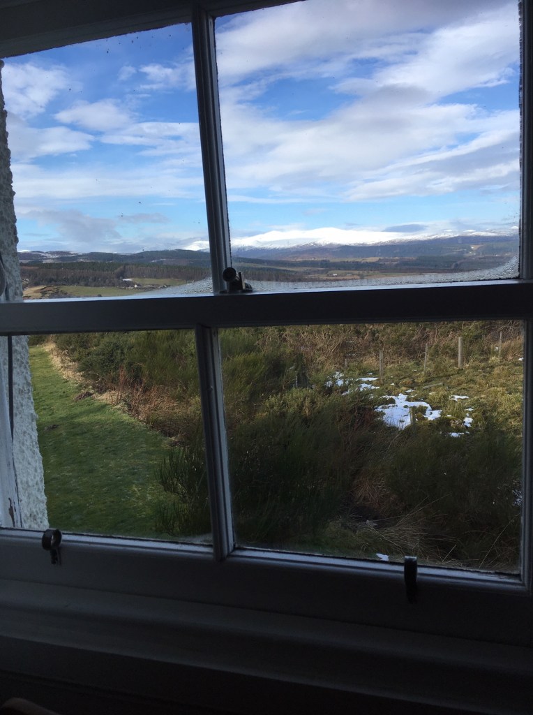 In early March a group of awardees gathered for a retreat at Moniack Mhor writers’ centre near Loch Ness. There was a monastic feel about that week, a deep silence in the building as people worked in their rooms or in favoured spots in outbuildings. I was lucky to have a room with a view over hills and fields and to have space and silence. I loved the solitude and dream-time and went for walks with a notebook, took recordings of water in its various forms: crunch of boots on crisp snow, the crack of my boot on a frozen puddle, the trickle of melt water. There was snow lying. The air was brittle cold. That triggers asthma and mild air hunger heightened a sense of unreality.